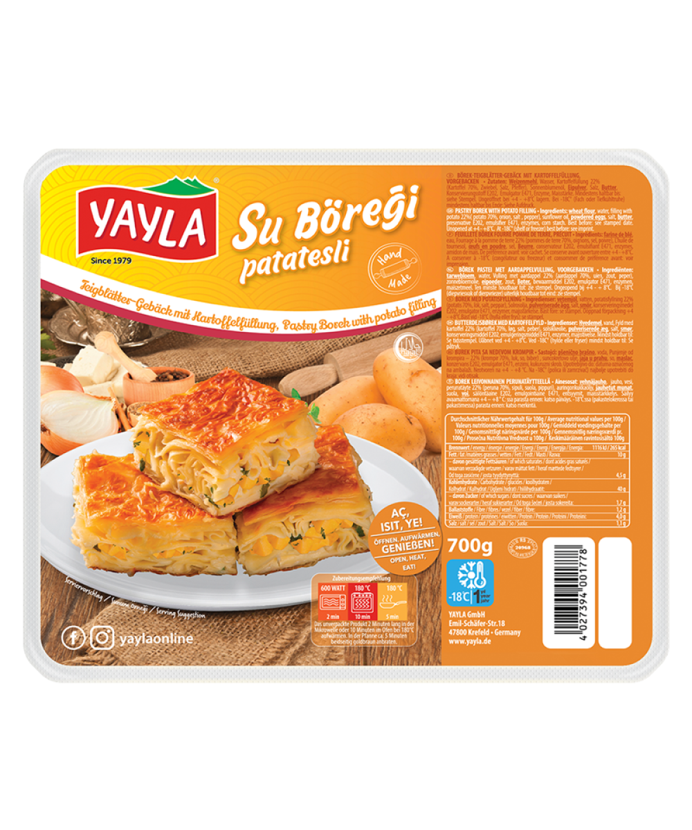 wheat flour, water, filling with potato 22%( potato 70%, onion, salt , pepper), sunflower oil, powdered eggs, salt, butter, preservative E202, E201, E200, emulsifier E471, antioxidant E330, corn starch.