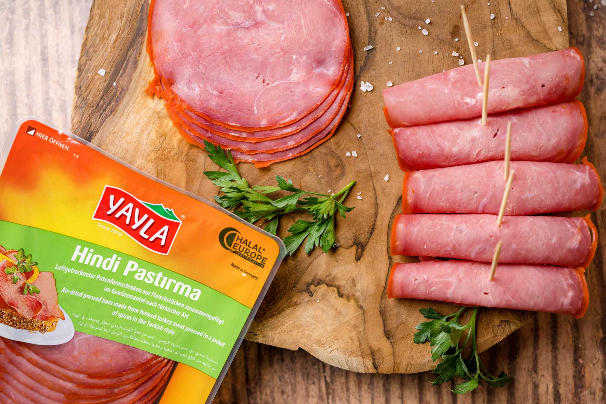 100g of Pastirma are made from 140g of beef. Ingredients: 97% (beef, iodized table salt (table salt, potassium iodate), spices, spice extracts, dextrose, seasoning, natural pepper aroma, Antioxidant: E301; ripening cultures), 3% spice jacket (coloring: paprika extract E160c; bovine gelatin, rapeseed oil, spices, common salt, preservative: E202). Surface treated with preservative: potassium sorbate. Can contain traces of mustard and celery