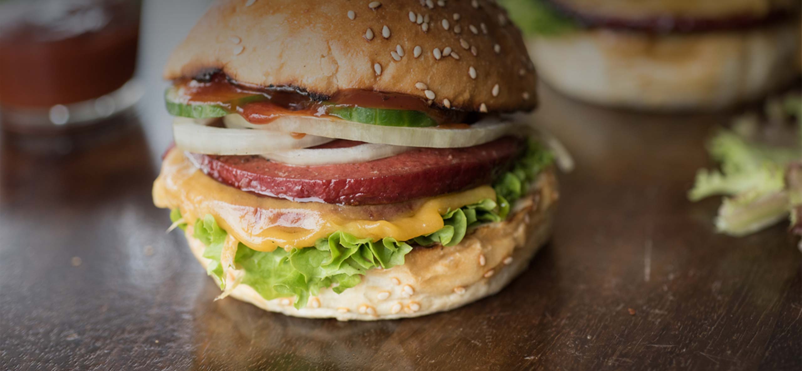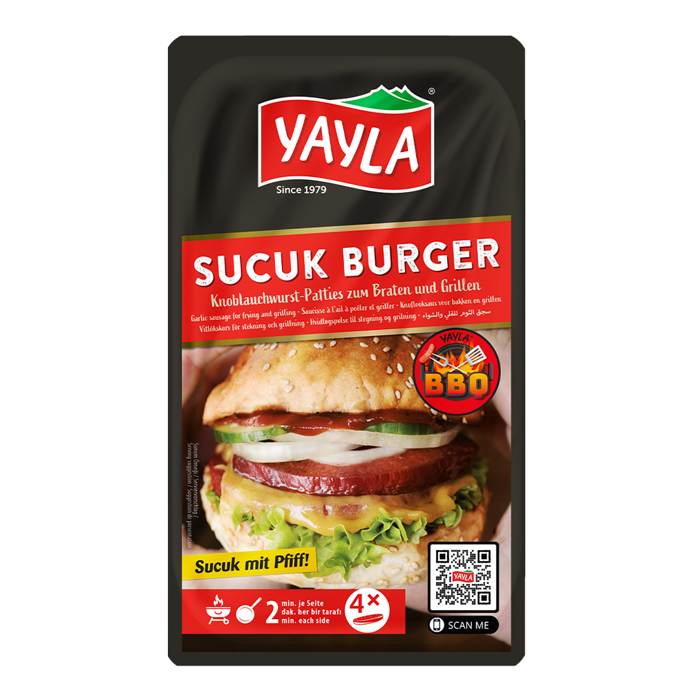 A great burger taste with spicy sausage, fresh vegetables and a creamy yoghurt sauce.